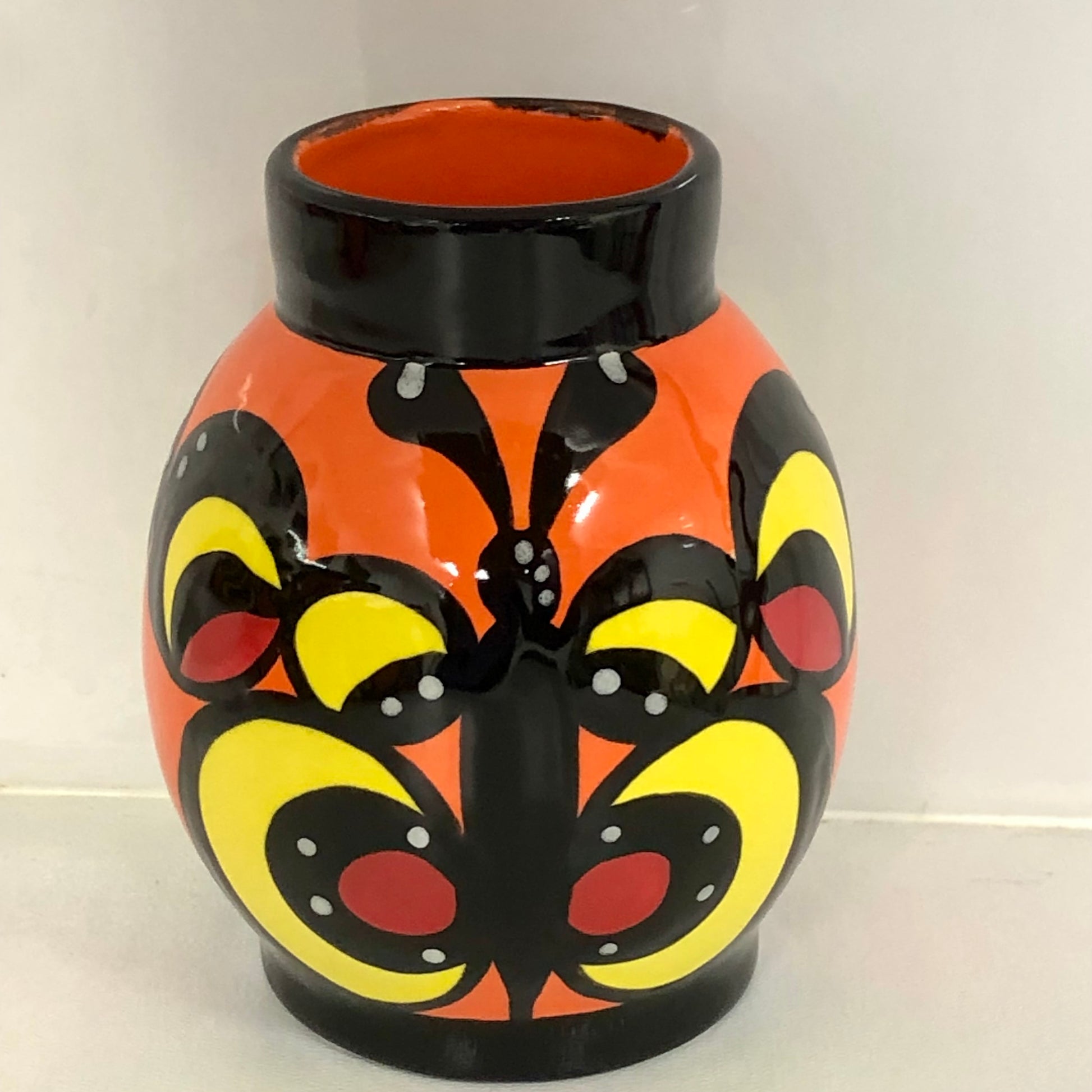 Hand thrown and hand decorated by Lorna Bailey herself, this vase features a stylised butterfly design consisting of multiple circles. It is glazed in her usual vivid colour palette and signed by Lorna on the base.