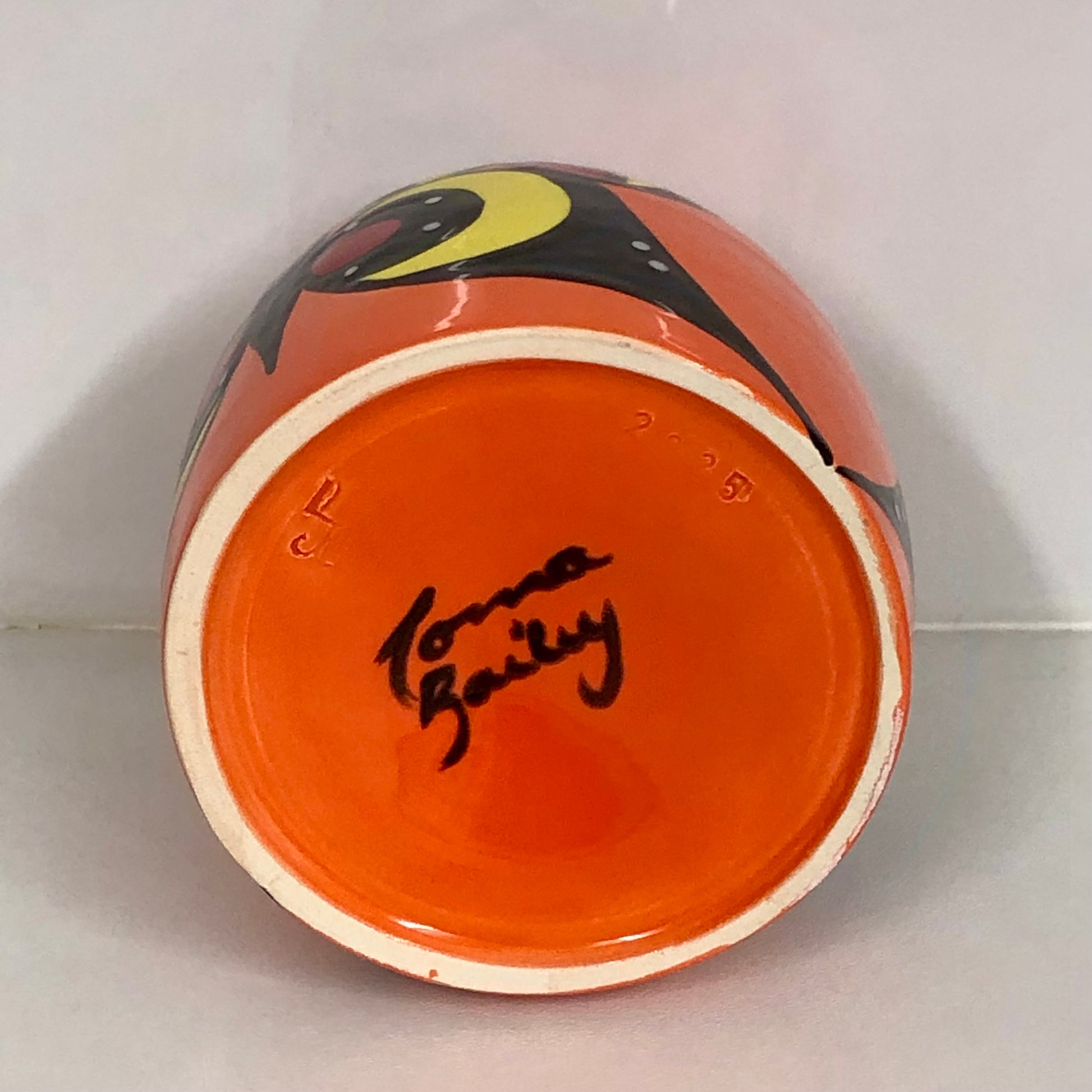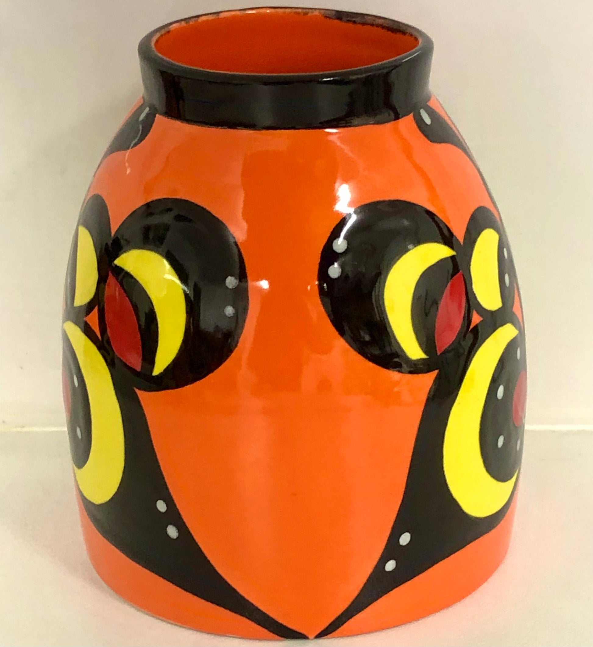Hand thrown and hand decorated by Lorna Bailey herself, this vase features a stylised butterfly design consisting of multiple circles. It is glazed in her usual vivid colour palette and signed by Lorna on the base.