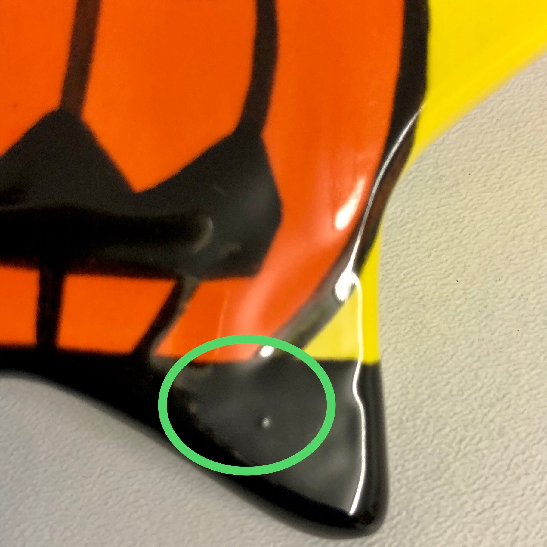 Each decoration is approximately 8.3cm in diameter & 0.8cm thick, and comes with a piece of black ribbon so it’s ready to hang. A few have come from the kiln with a slight fault on them (see photos for details) and are offered at a reduced price.